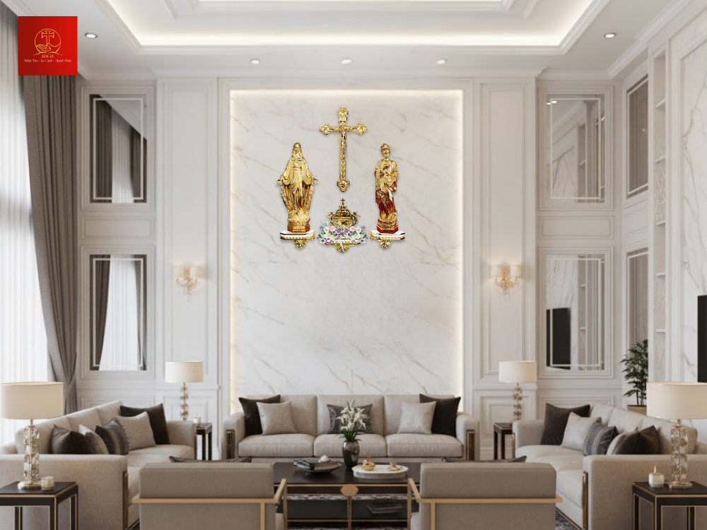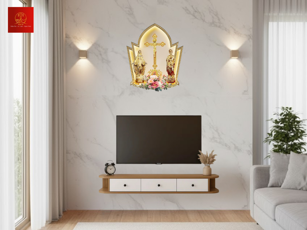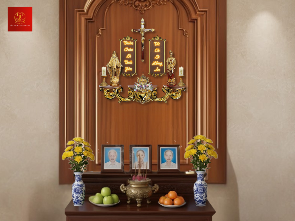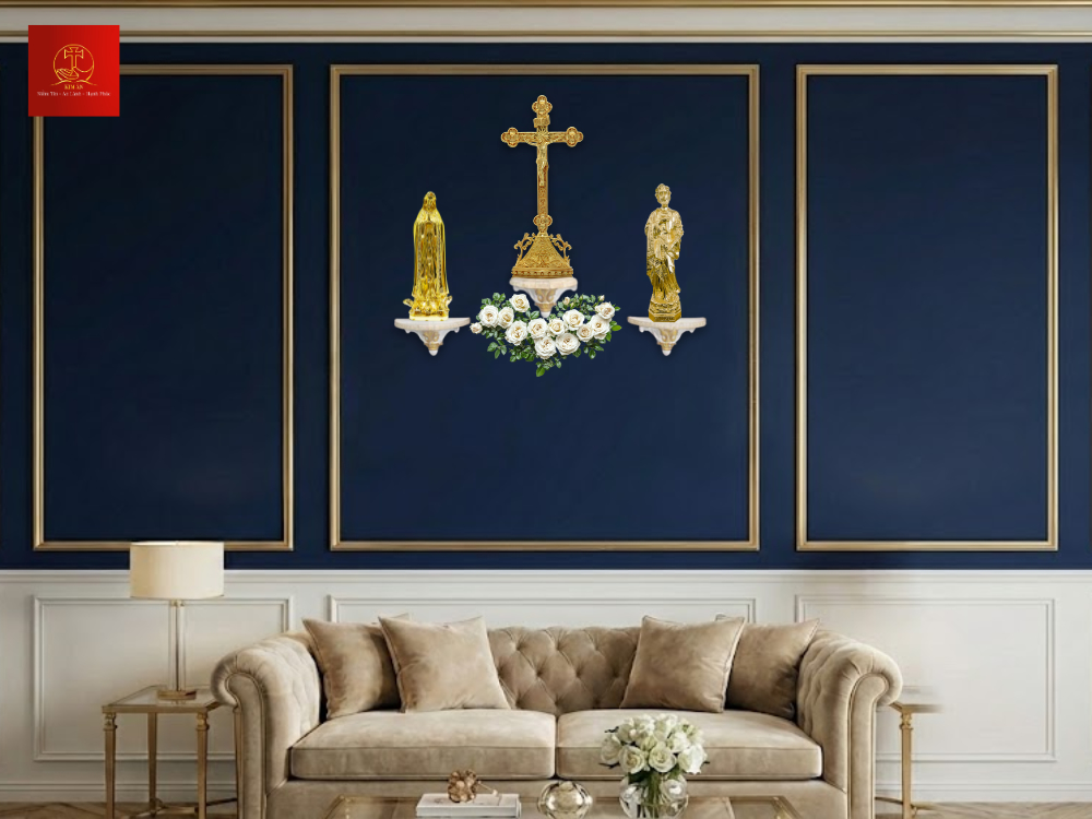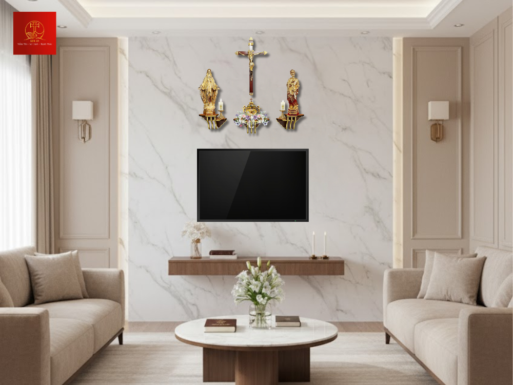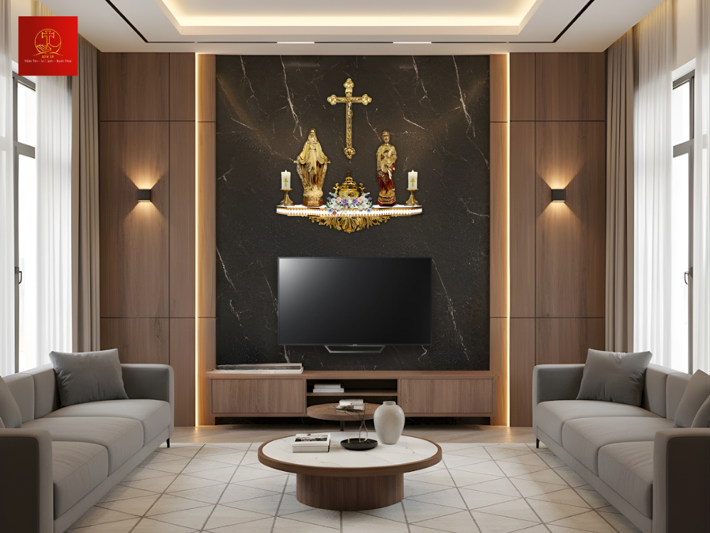Bàn thờ Công giáo treo tường nhỏ gọn, giải pháp tối ưu cho phòng khách chung cư hiện đại.