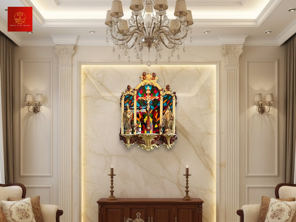 Mẫu bàn thờ Công giáo treo tường kính màu cổ điển với khung chạm nổi 3 vòm, lý tưởng cho phòng khách hoặc căn hộ nhỏ, mang nét trang nghiêm và hài hòa cho không gian thờ phượng.