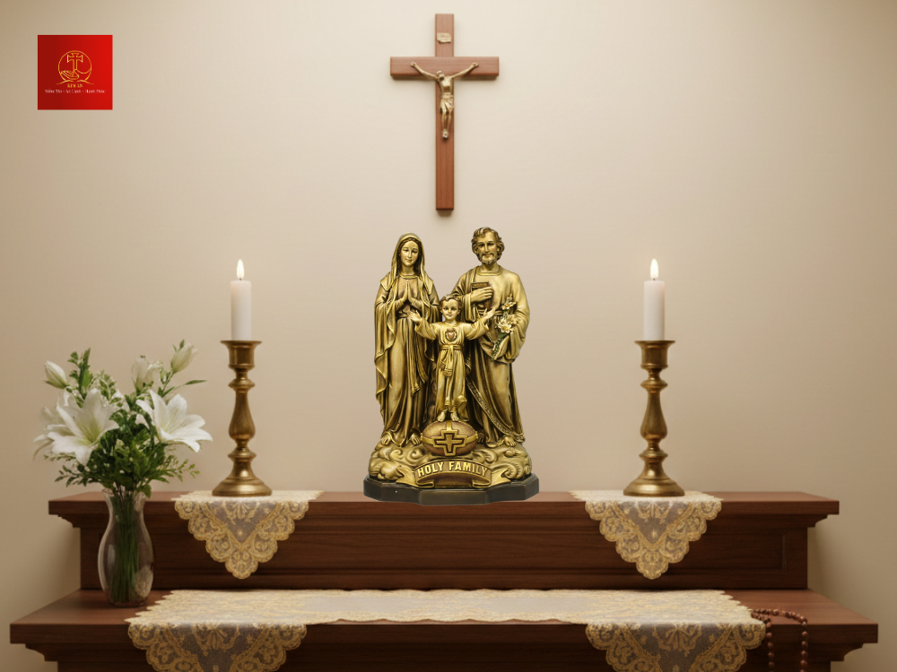 - Bộ tượng Thánh Gia (Đức Mẹ – Chúa Hài Đồng – Thánh Giuse liền khối) kích thước cao 35 – 38 cm, ngang 20 – 22 cm, sâu 12 – 14 cm