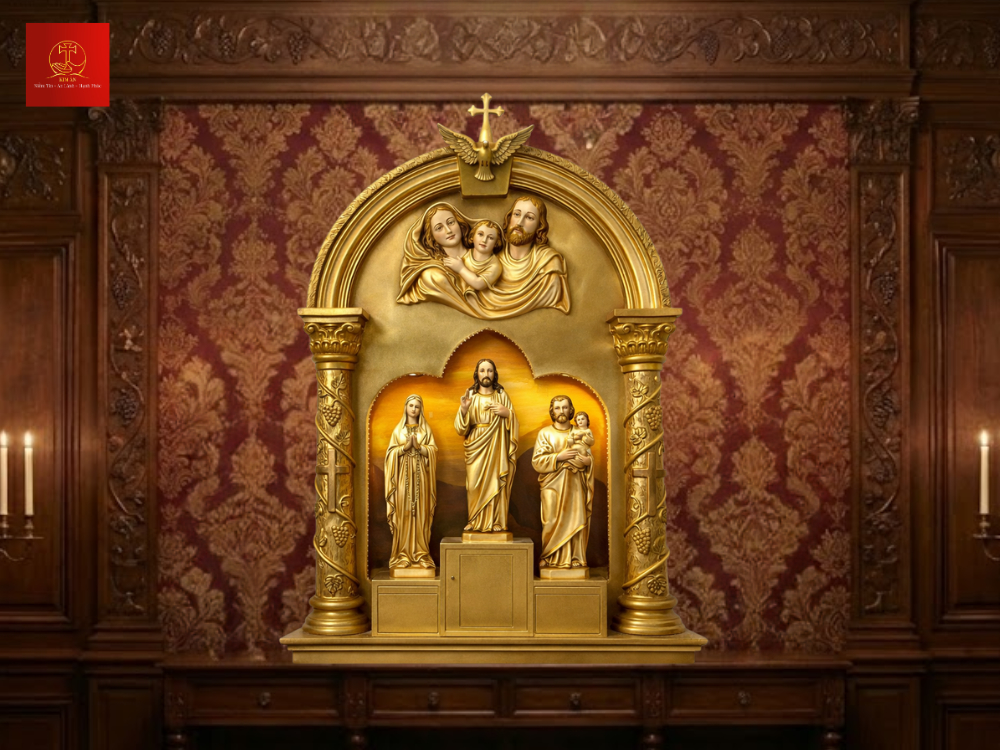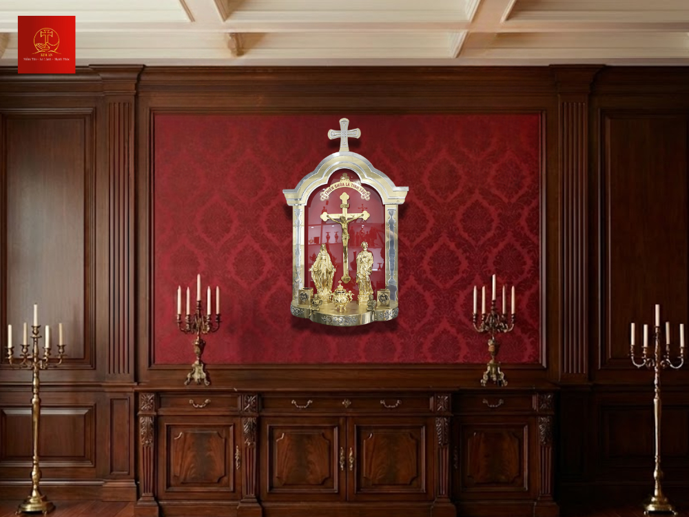 Bàn thờ Công giáo mini treo tường được chế tác từ đồng mạ vàng Gold, mang lại vẻ đẹp trường tồn cho không gian nhỏ.