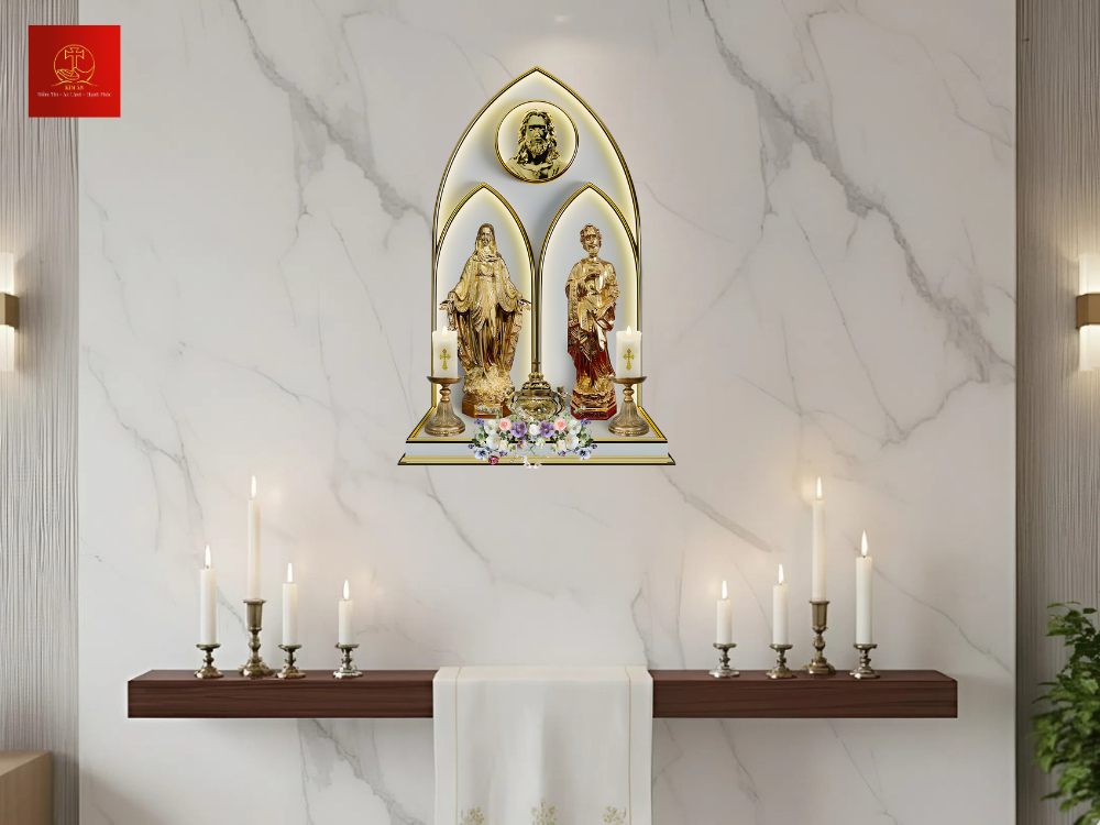 Bộ bàn thờ công giáo mini dạng tòa thờ treo tường dạng vòm hiện đại, tối ưu không gian cho căn hộ nhỏ.