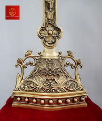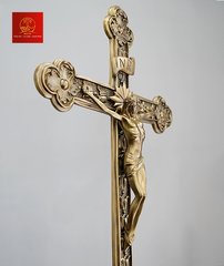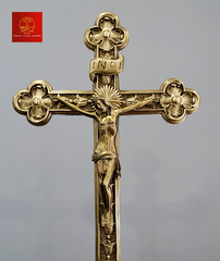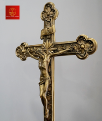 Thánh Giá hoa đào có đế được làm bằng chất liệu đồng thau, công nghệ xử lý tạo màu sản phẩm mang màu sắc giả cổ, vàng gold đặc trưng của Kim Ân, bề mặt sản phẩm được phủ một lớp bảo vệ giúp sản phẩm không bị ảnh hưởng từ môi trường, giữ cho màu sắc không bay màu.