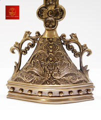 Thánh giá hoa đào có đế được làm bằng chất liệu đồng thau, công nghệ xử lý tạo màu sản phẩm mang màu sắc đặc trưng của Tâm Đức, bề mặt sản phẩm được phủ một lớp bảo vệ giúp sản phẩm không bị ảnh hưởng từ môi trường, giữ cho màu sắc không bay màu.