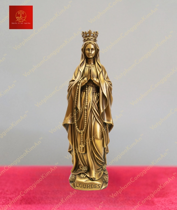 Tượng Mẹ Lộ Đức đội vương miện, tay đeo chuỗi và chắp trước ngực không chỉ là một tác phẩm nghệ thuật tâm linh mà còn mang giá trị thẩm mỹ và ý nghĩa sâu sắc. Với chất liệu đồng mạ vàng cao cấp cùng thiết kế tinh tế, sản phẩm này là lựa chọn hoàn hảo để tôn vinh đức tin và tạo không gian linh thiêng cho gia đình bạn.