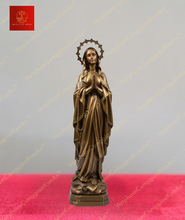 Hình ảnh Đức Mẹ Lộ Đức được khắc họa sống động với vầng hào quang rực rỡ và chuỗi Mân Côi đeo trên tay, thể hiện sự thanh tịnh và lòng từ bi. Từng chi tiết nhỏ trên tượng đều được gia công tỉ mỉ, từ nét mặt hiền từ đến nếp áo mềm mại, mang lại cảm giác trang nghiêm và gần gũi. Sản phẩm này sẽ là điểm nhấn tâm linh trong không gian của bạn.