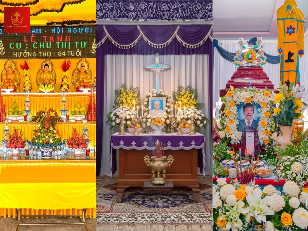 Phân biệt Linh đường đám tang Công giáo (giữa) và đạo Phật (trái), đạo Cao Đài (phải)