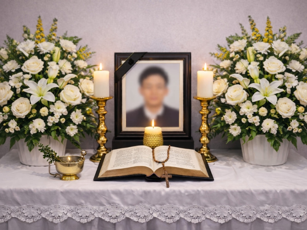 - Sách Thánh (Kinh Thánh): Có thể đặt một cuốn Kinh Thánh mở sẵn để thể hiện sự hiện diện của Lời Chúa trong gia đình lúc đau buồn.
