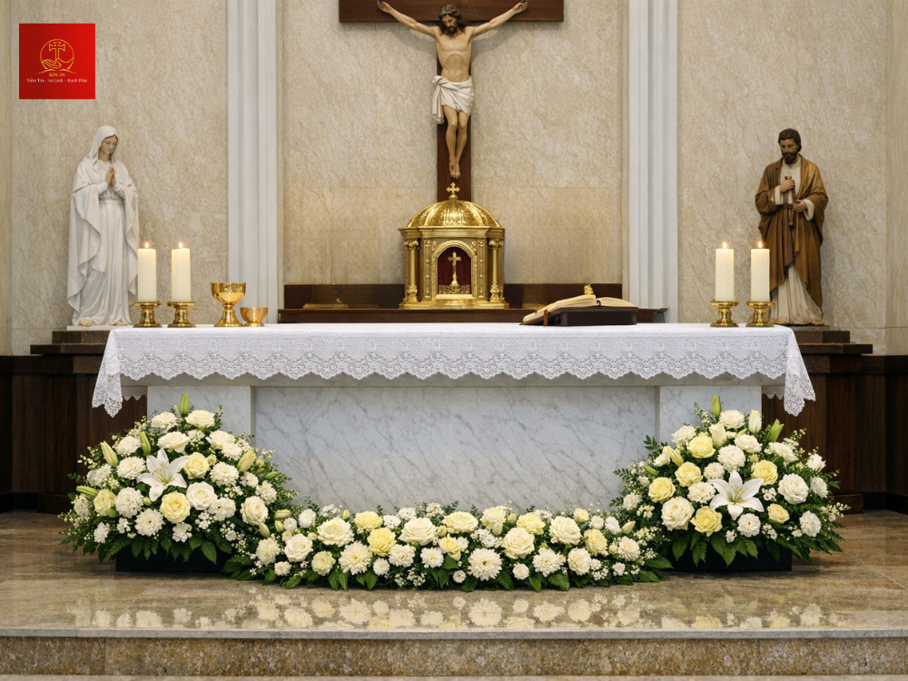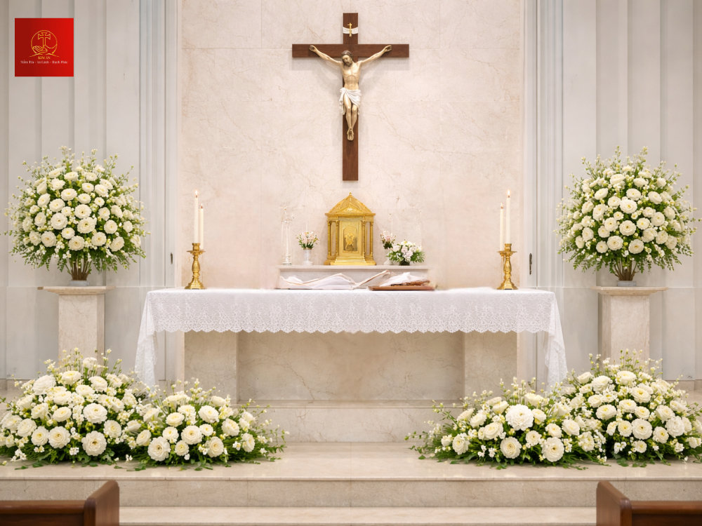- Hoa phải được đặt dưới chân bàn thờ hoặc hai bên, không được đặt trực tiếp lên mặt bàn thờ làm lễ (Bàn Tiệc Thánh).